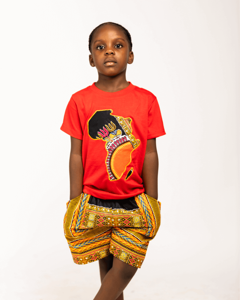Unisex style T-shirts and shorts set. African kente pattern patchwork T-shirts. Immersed in the rich African culture, eye-catching patchwork print. Makes an excellent choice for both boys and girls that appreciates world class fashions with a touch of the unique African design.