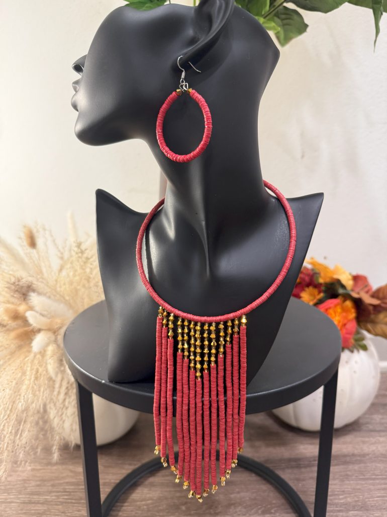 Fashion chain choker collar necklace. Multiple twisted beads cluster choker. Necklace with earrings. Ethnic colorful beads, layered beads collar necklace. Africa chunky necklace.