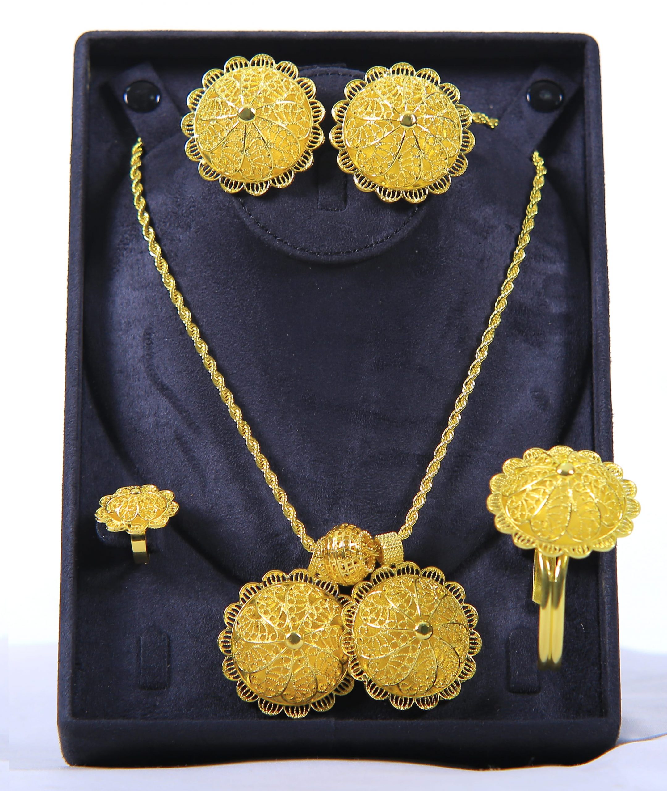 necklace, matching ring, earrings and a statement bracelet, all made with intricate designs. Whether