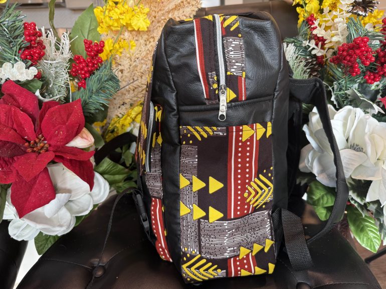 Multicolored kente fabric intertwined with soft leather for a lightweight tough backpack. Spacious, adjustable straps. Perfect for everyday use and travels