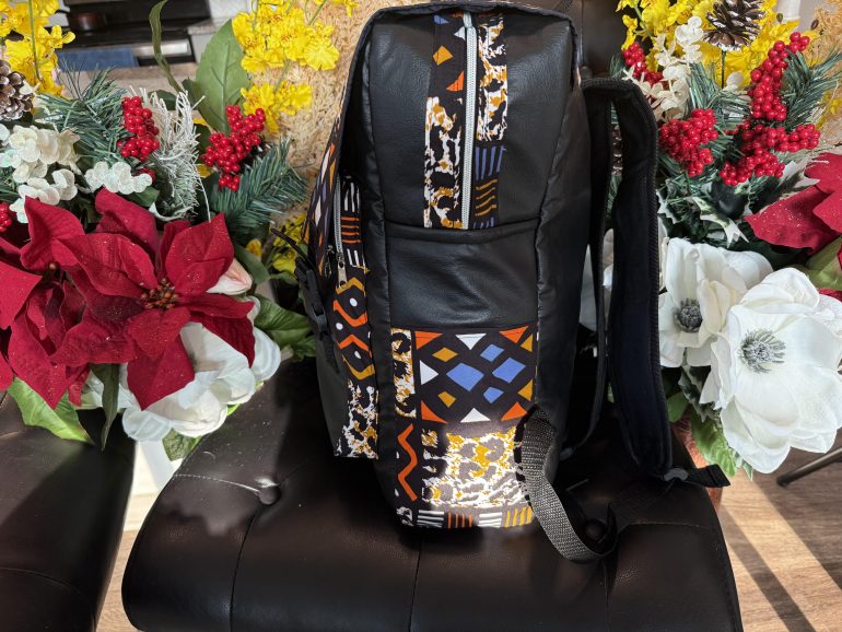 Multicolored kente fabric intertwined with soft leather for a lightweight tough backpack. Spacious, adjustable straps. Perfect for everyday use and travels