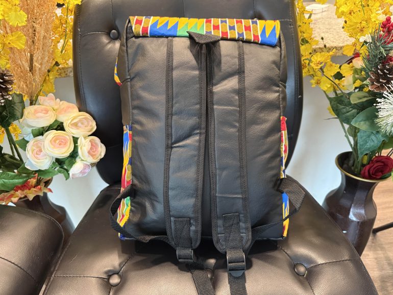 Multicolored kente fabric intertwined with soft leather for a lightweight tough backpack. Spacious, adjustable straps. Perfect for everyday use and travels