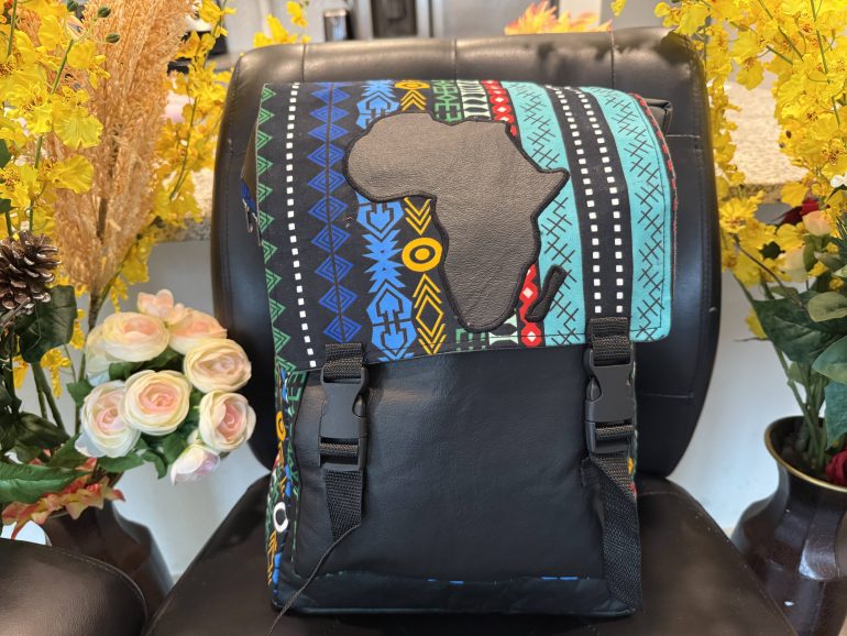 Multicolored kente fabric intertwined with soft leather for a lightweight tough backpack. Spacious, adjustable straps. Perfect for everyday use and travels