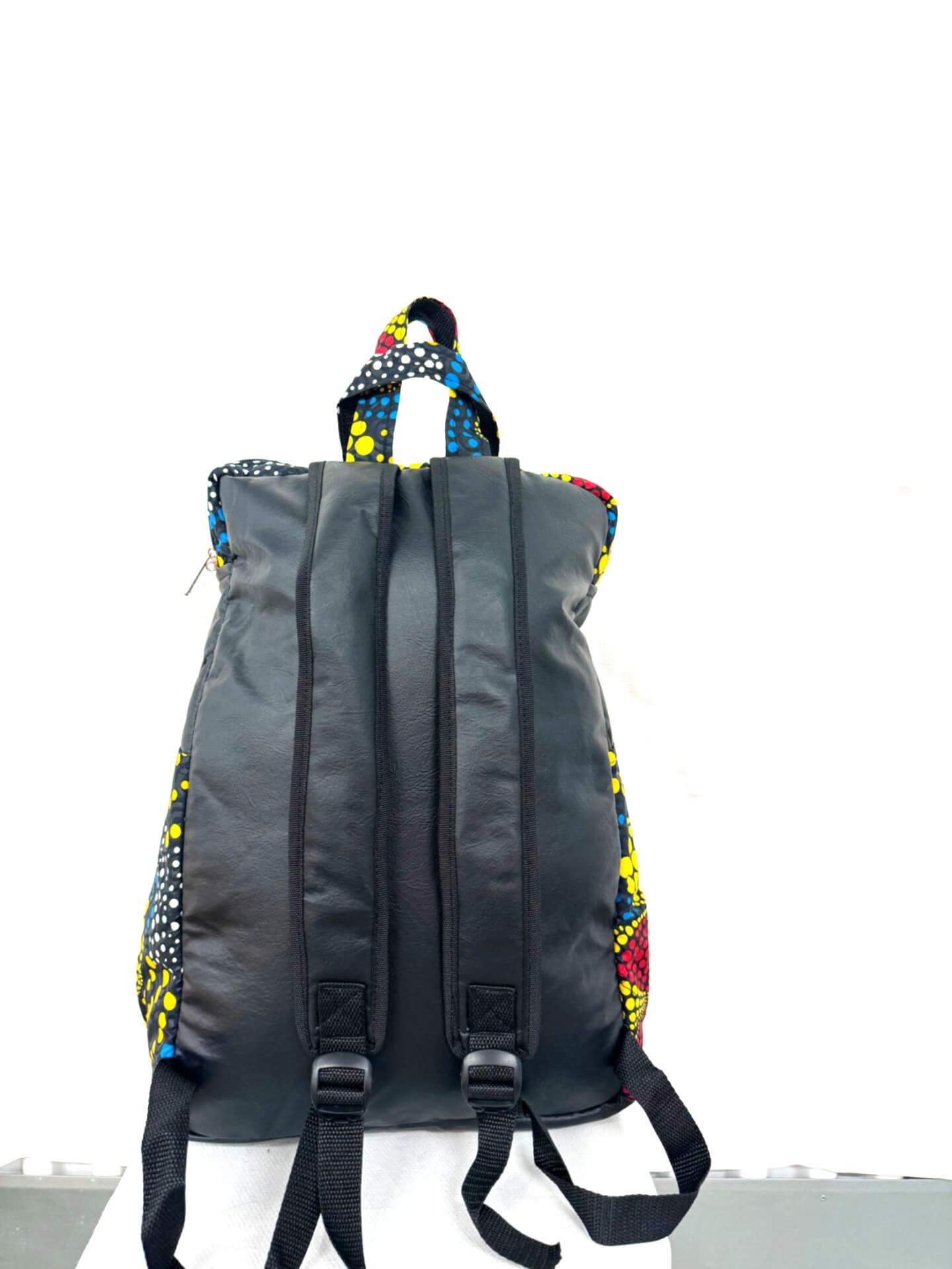 Multicolored kente fabric intertwined with soft leather for a lightweight tough backpack. Spacious, adjustable straps. Perfect for everyday use and travels