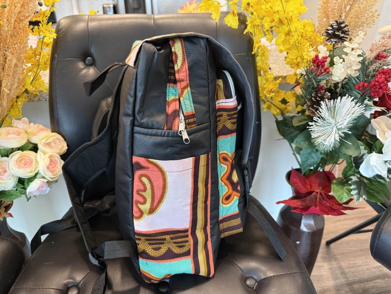 Multicolored kente fabric intertwined with soft leather for a lightweight tough backpack. Spacious, adjustable straps. Perfect for everyday use and travels
