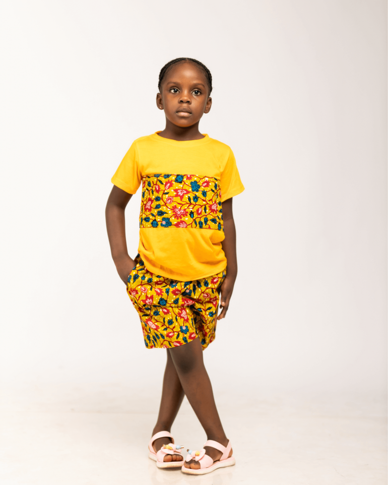 Unisex style T-shirts and shorts set. African kente pattern patchwork T-shirts. Immersed in the rich African culture, eye-catching patchwork print. Makes an excellent choice for both boys and girls that appreciates world class fashions with a touch of the unique African design.