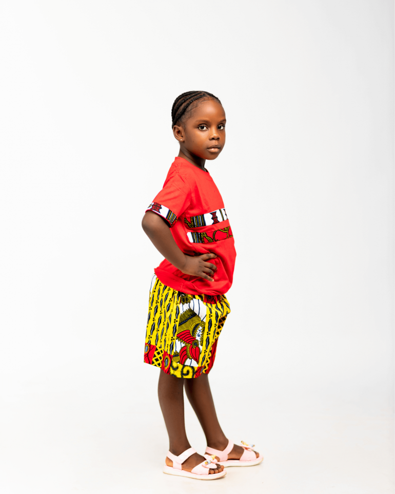 Unisex style T-shirts and shorts set. African kente pattern patchwork T-shirts. Immersed in the rich African culture, eye-catching patchwork print. Makes an excellent choice for both boys and girls that appreciates world class fashions with a touch of the unique African design.