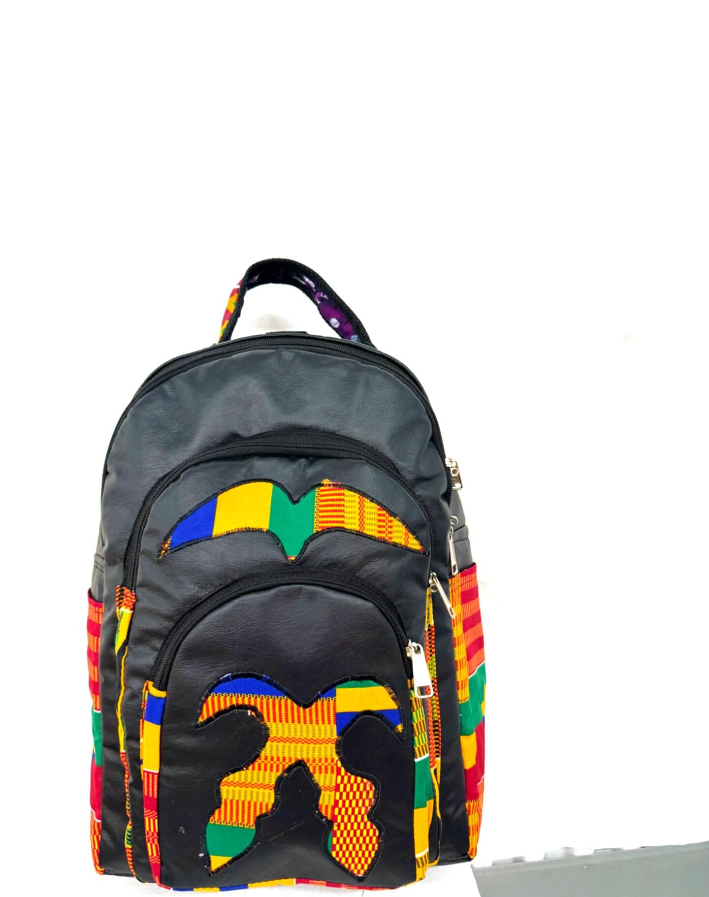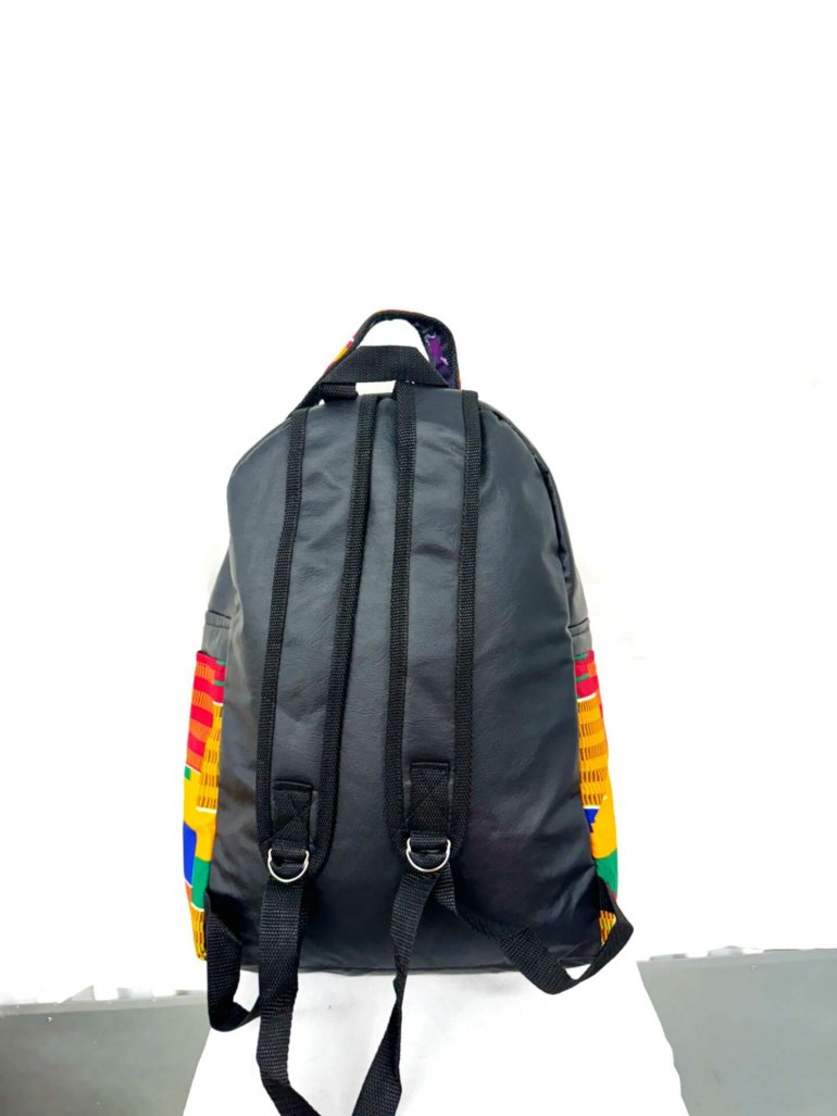 Multicolored kente fabric intertwined with soft leather for a lightweight tough backpack. Spacious, adjustable straps. Perfect for everyday use and travels