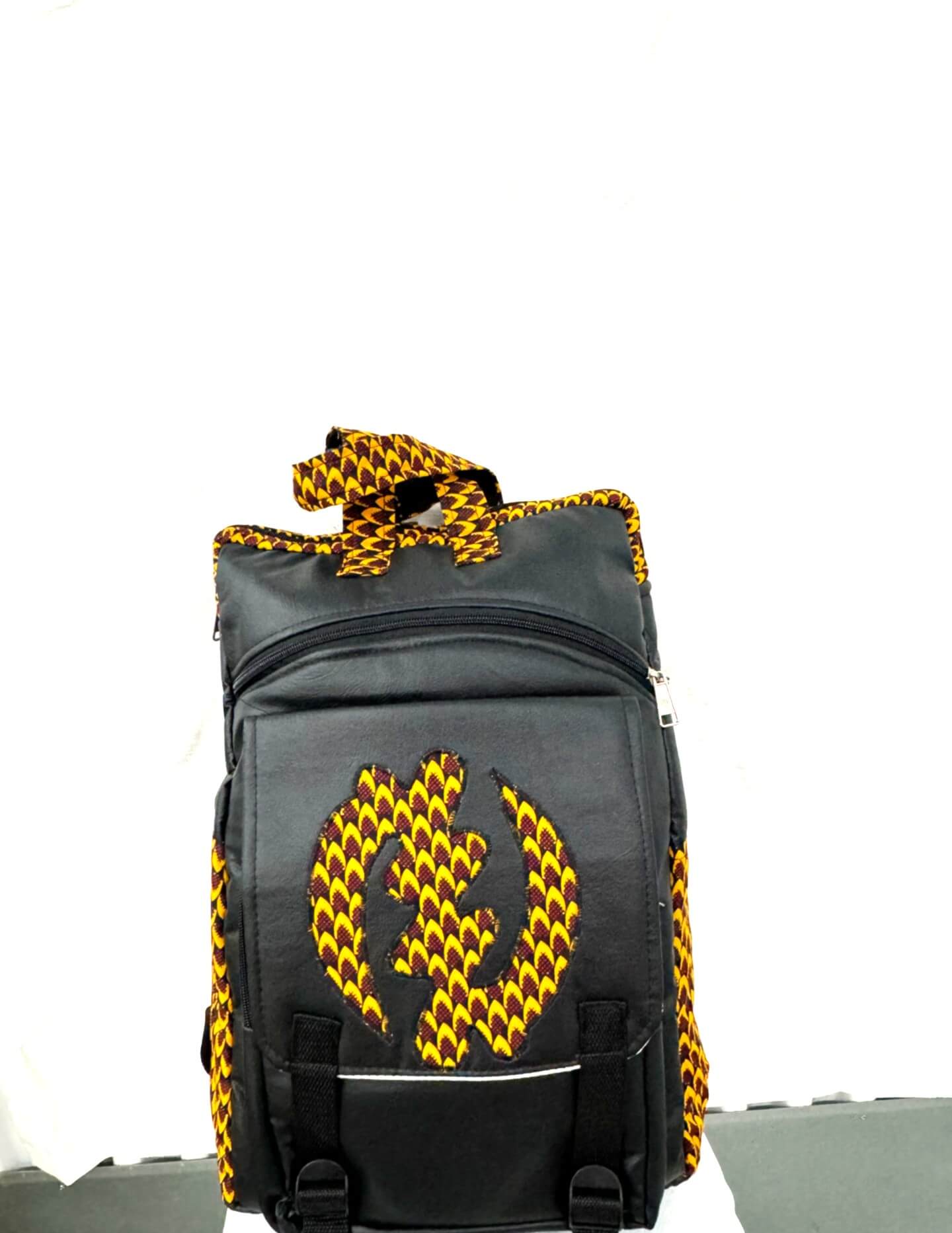 Multicolored kente fabric intertwined with soft leather for a lightweight tough backpack. Spacious, adjustable straps. Perfect for everyday use and travels