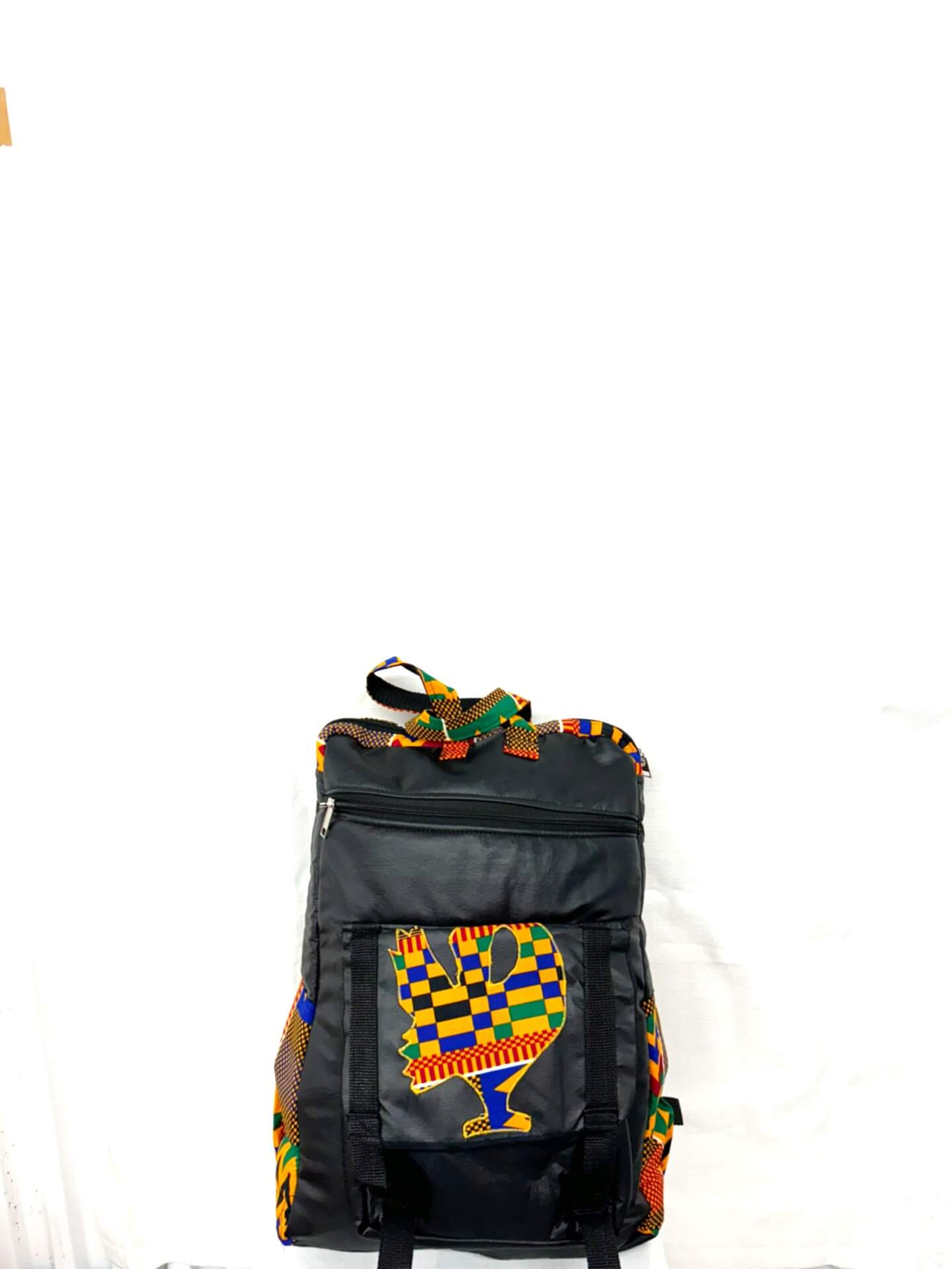 Multicolored kente fabric intertwined with soft leather for a lightweight tough backpack. Spacious, adjustable straps. Perfect for everyday use and travels