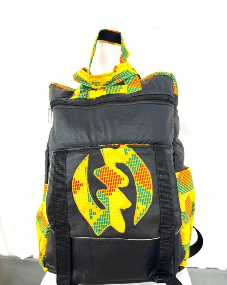 Multicolored kente fabric intertwined with soft leather for a lightweight tough backpack. Spacious, adjustable straps. Perfect for everyday use and travels